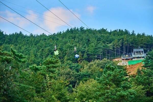 정상까지는 셔틀버스를 타고 올라가는데, 올라가는 길도 산세가 아름다워 창밖을 보는 재미가 쏠쏠합니다. 짚와이어는 2인 1조로 동시에 출발할 수 있어, 연인이나 가족, 친구와 함께라면 더욱 특별한 추억이 될 거예요.