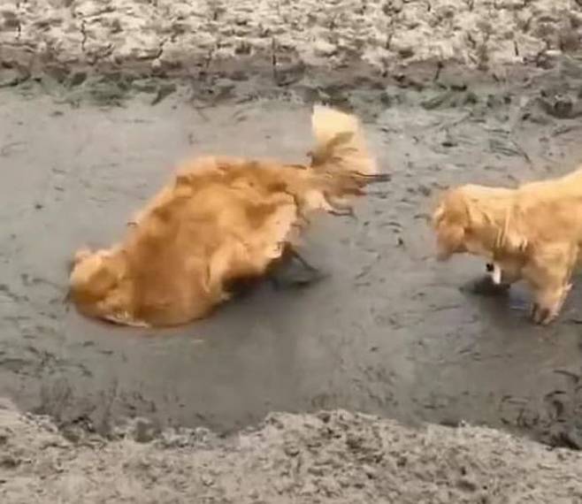 잠시후 골든 리트리버 강아지는 물 만난 물고기라도 되는 것 마냥 진흙탕에서 온몸을 뒹구르며 뛰어 놀았는데요.