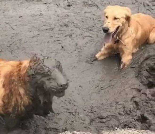 이날 집사는 두 골든 리트리버 강아지들을 데리고 산책을 하러 나왔다가 진흙탕을 발견하게 되었다고 합니다.