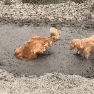 골든 리트리버 강아지들은 세상 해맑은 표정으로 진흙탕에 뛰어들어가더니 온몸을 마음껏 뒹구르는 것이 아니겠습니까.