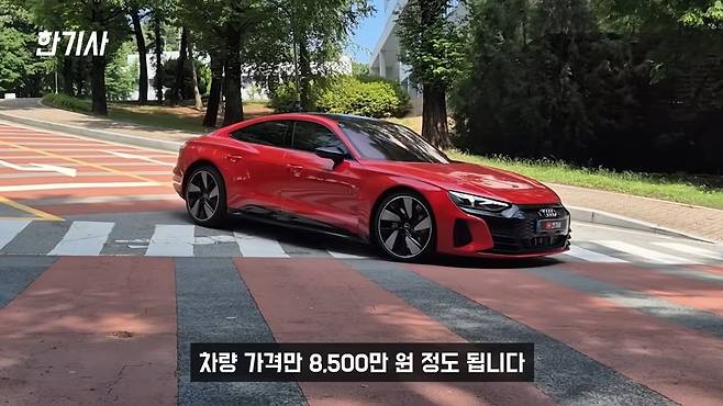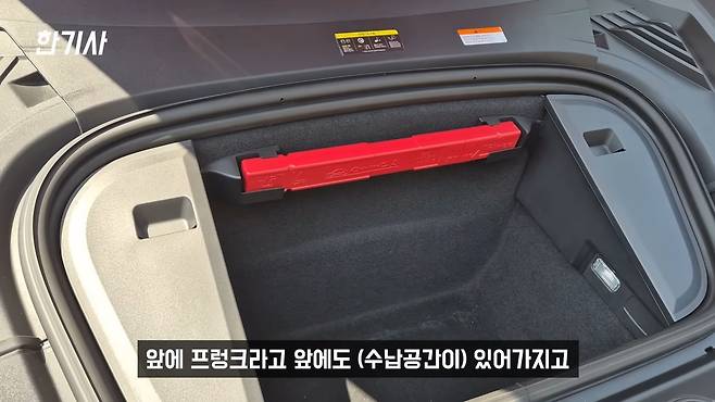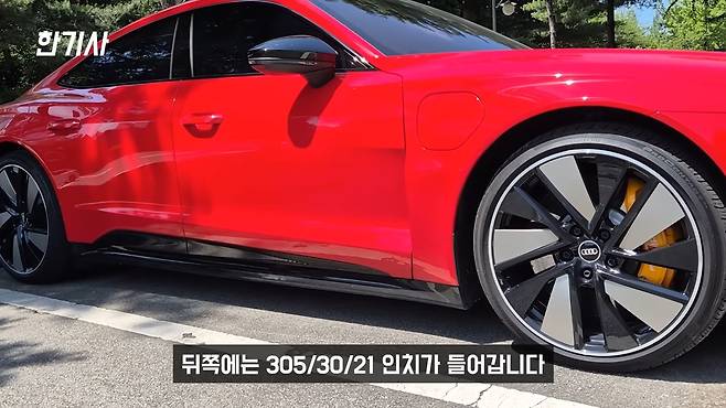 제 메인카인 아우디 e-트론 GT에 대해 말씀드리겠습니다. 이 차량은 2021년 12월식 아우디 콰트로 프리미엄 트림으로, 옵션이 많이 들어간 모델입니다. 외장 색상은 탕고 레드, 실내는 브라운 컬러 시트죠. 아우디 e-트론 GT는 포르쉐 타이칸과 플랫폼, 모터, 배터리 등 대부분의 핵심 부품을 공유하는 이른바 ‘형제차’ 관계라고 할 수 있습니다. 심지어 프렁크, 즉 앞쪽 트렁크를 열어보면 공구나 잭 같은 부품에 포르쉐 마크가 박혀있을 정도입니다.