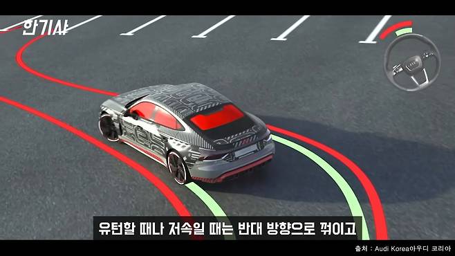 후륜 조향 기능도 아주 유용합니다. 저속에서는 반대 방향, 고속에서는 같은 방향으로 뒷바퀴가 조향되어서 유턴이나 끼어들기, 코너링 시 안정감을 더해줍니다.