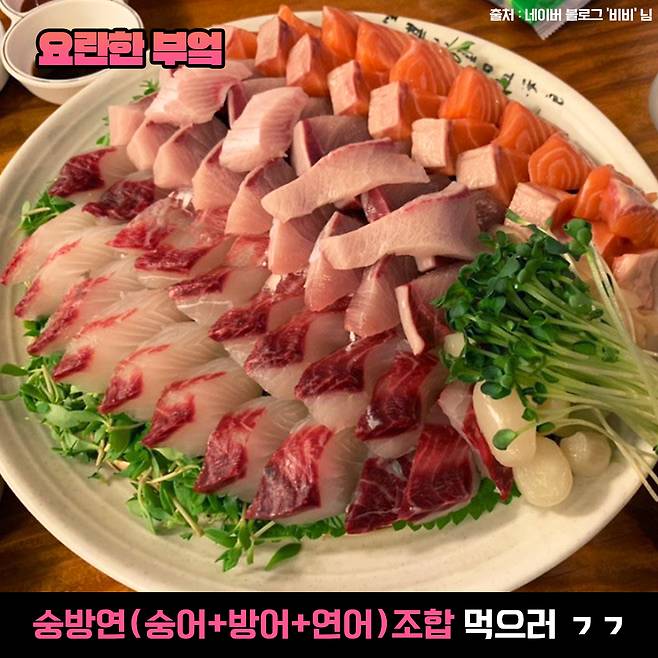 요란한 부엌은 방어 단독 메뉴보다는 혼합 구성이 시그니처인데요. 광방연(광어+방어+연어), 숭방연(숭어+방어+연어)의 구성이 인기라고 하니, 여러 가지 회를 다 즐기고 싶다면 요란한 부엌 추천할게요~