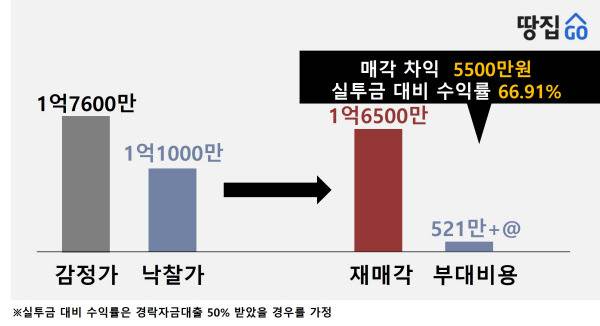 A씨는 해당 빌라를 낙찰받은지 130일이 지난 올해 3월 1억6500만원에 매각했다. 낙찰가 대비 매각 차익은 5500만원이었다. 세금 등 각종 부대비용을 제하면 순수익은 약 4028만원이다. 경락잔금대출(50%)를 받았다면 실제 낙찰자가 투입한 자본은 약 6021만원 수준이고, 자기자본 수익률(ROE)은 67% 정도다.
