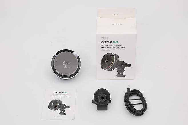 구성품으로는 모락 조나 A9 Qi2 차량용 거치대 본체와 송풍구 클립, USB C to C 케이블, 그리고 사용 설명서가 제공되고 있다.
