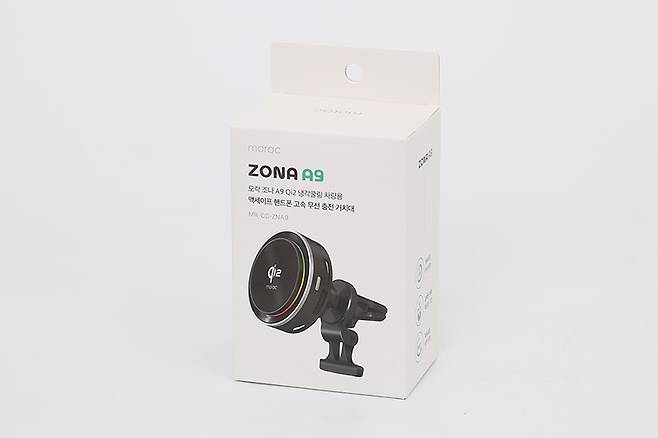 모락 조나 A9 Qi2 차량용 거치대는 자그마한 흰색 상자에 담겨 있다. 상자 앞면에는 제품의 컬러 이미지가 비교적 상세하게 나와 있기 때문에 개봉 전에도 기본적인 디자인을 가늠하기는 어렵지 않다.