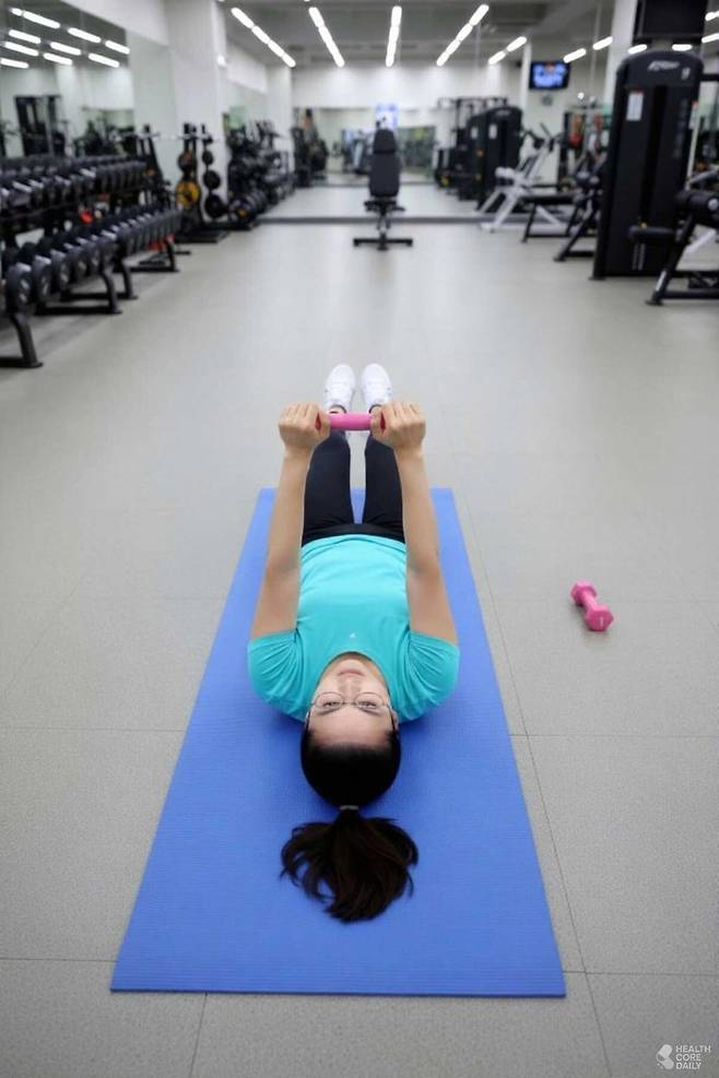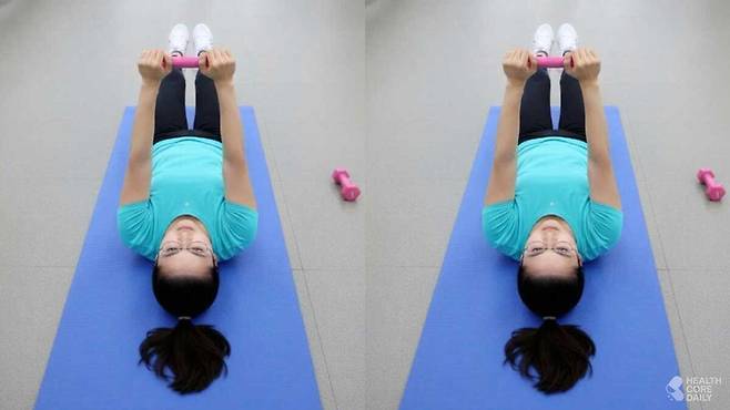 1) 벤치에 등을 대고 누운 후, 양손에 아령을 쥔다.