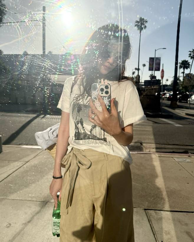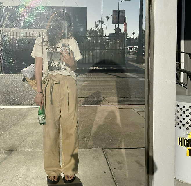 이지아님은 흰색 프린팅 반소매 티셔츠와 넉넉한 베이지 컬러 와이드 팬츠를 매치해 쿨한 여름 감성을 자아냈습니다.