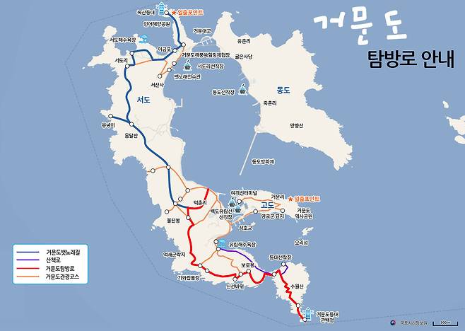 거문도는 고도·동도·서도, 세 개의 섬으로 이루어져 있습니다. 동도와 서도는 거문대교로 연결되어 있어 이동이 편리하고, 고도를 중심으로 항구와 마을이 형성돼 있습니다. 섬 곳곳에는 근대 어촌마을의 흔적과 함께 전설이 깃든 바위, 동굴, 지명이 남아 있어 걷는 것만으로도 이야기를 만나는 여행이 됩니다.