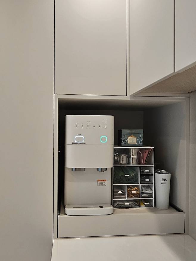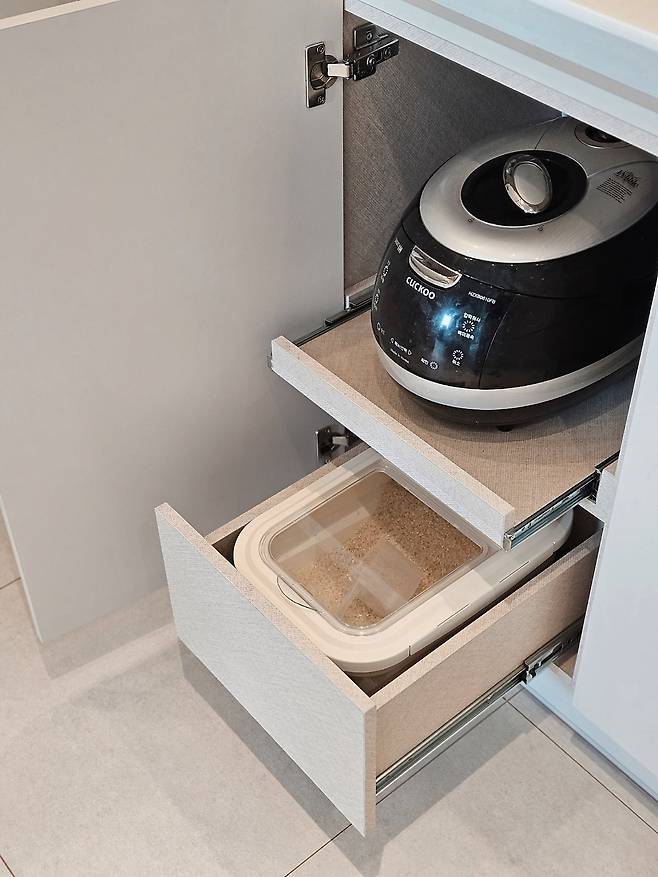 좁은 주방에서는 동선이 매우 중요하다고 생각해요. 그래서 물건을 수납할 때도 동선에 신경을 써서 수납했습니다. 예를 들면 정수기 근처엔 커피나 차를 마실 수 있는 수납함, 영양제, 컵 등을 배치하고, 밥솥 바로 아래 서랍에는 쌀통을 넣었어요.