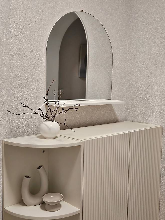 저희 집 현관은 공간이 꺾여있는 구조예요. 여기에 딱 맞도록 코너형 선반을 배치하고 도자기 소품으로 포인트를 주었습니다. 덕분에 밝고 편안하면서도 여유로운 분위기가 나요.