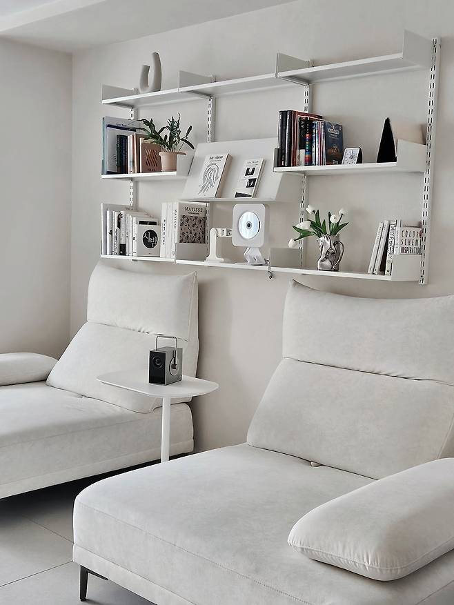 하지만 온 가족이 함께하는 곳인 만큼 거실은 책만 읽는 공간이 아니기에, 너무 많은 책이 있으면 답답해 보일 것 같아 그때그때 읽을 최소한의 책만 비치해두고 미니멀하게 꾸몄어요.