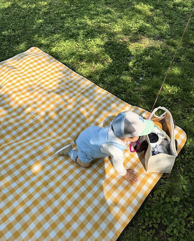 아들 또한 파스텔 블루 오버롤과 캡모자로 통통 튀는 귀여움을 발산했으며, 잔디 위 체크 피크닉 매트와 어우러진 모습은 상큼한 분위기의 정점을 찍었습니다.