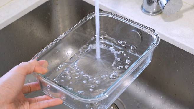 꽃봉오리를 열기 위해 먼저 브로콜리가 잠길 수 있는 깊이의 통 하나를 준비하세요. 그리고 물을 충분히 받아 줍니다.