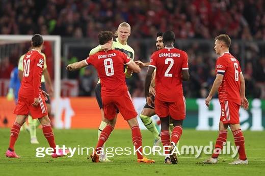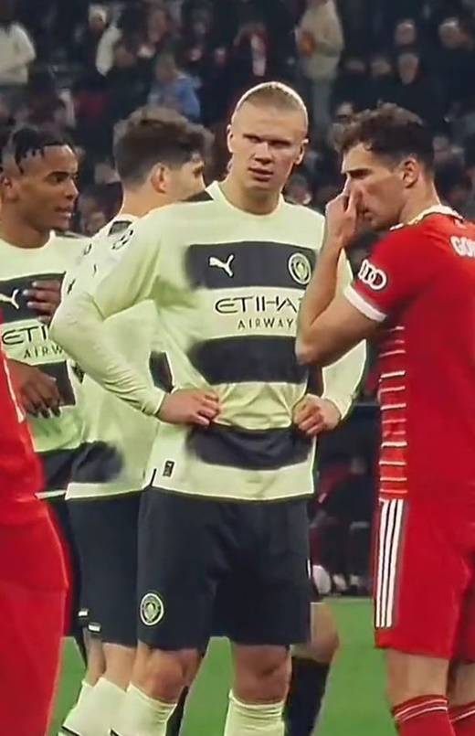 [맨시티와 바이에른 뮌헨의 챔피언스 리그 8강전에서 홀란드가 배를 만지며 웃는 반면 수비를 하고 있는 바이에른 뮌헨의 미디플더 고레츠카는 코를 막고 있다. 사진=데일리스타 캡쳐, 게티이미지코리아]