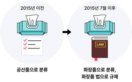 2010년대 초반 물티슈에 독성물질이 함유됐다는 사실이 밝혀지면서 정부는 2015년 7월부터 물티슈를 기존 공산품에서 화장품으로 분류를 바꿔 화장품 법에 따라 관리하기 시작했습니다. 즉, 물티슈에 들어가는 성분도 화장품처럼 다소 엄격하게 적용하고 있습니다.