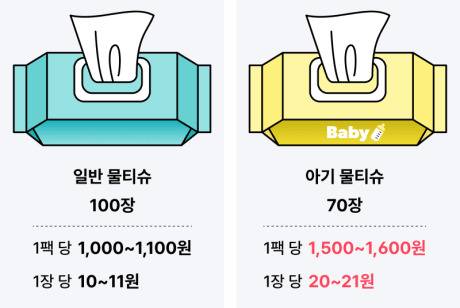 보다 엄격한 규제 관리가 진행되는 만큼 아기 물티슈는 일반 물티슈에 비해 1.5~2배 가량 비싼 가격대를 가집니다. 조금 더 좋은 성분과 원단을 사용하는 프리미엄 급 제품의 경우는 팩당 가격이 2000원을 넘어가기도 합니다.
