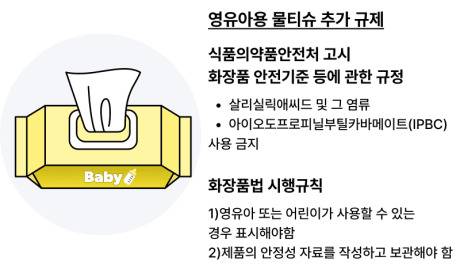 물티슈가 화장품 법으로 관리되기 시작하면서, 기존 영유아 및 13세이하 아동들의 화장품에 적용되던 추가 기준을 아기 물티슈에도 그대로 적용되기 시작했습니다. 내용은 다음과 같습니다.