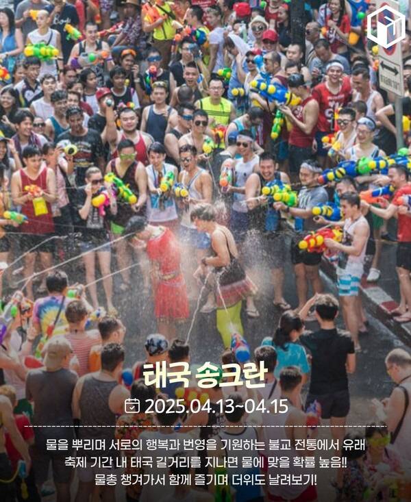 1년 중 가장 더운 시기이기도 한 태국의 설날, 서로에게 물을 뿌리며 무더위를 식힐 수 있음은 물론 행운과 축복을 나누는데요. 축제 기간 태국의 주요 거리에서는 상대를 가리지 않고 물을 뿌리는 풍경을 볼 수 있습니다. 세계의 관광객들도 다수 참여해 즐거운 물총놀이를 즐길 수 있죠.