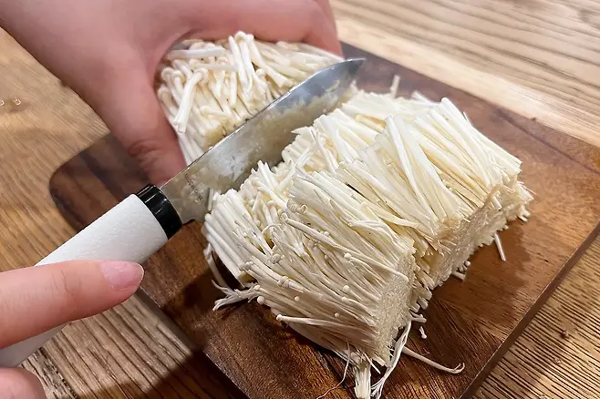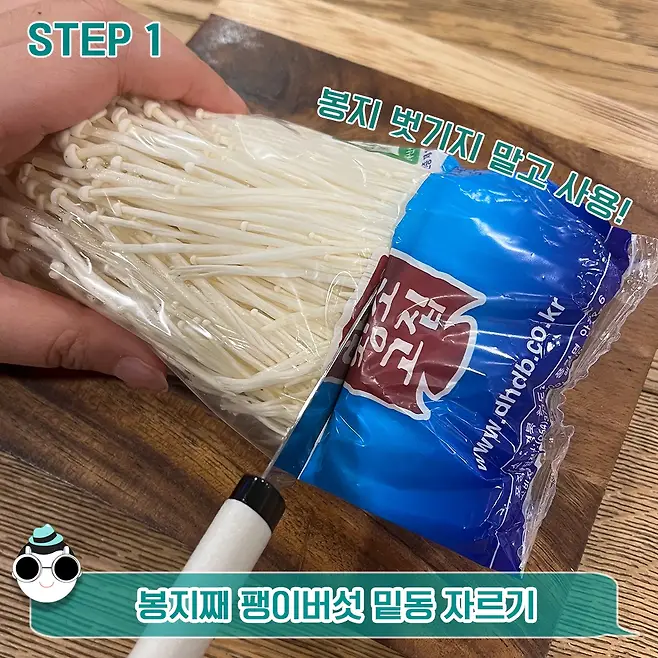 STEP 1. 봉지째 팽이버섯 밑동 자르기