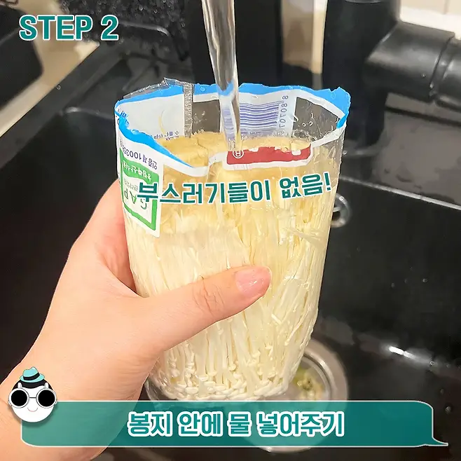 봉지 안에다 물을 넣어줄 거예요. 이렇게 세척해 준다면 떨어지는 팽이버섯들은 없겠죠?ㅎㅎ