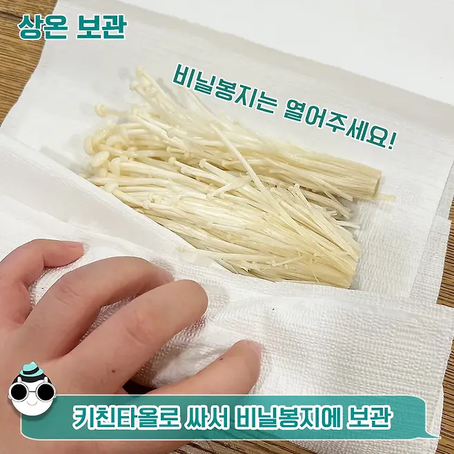 첫 번째로 상온 보관할 땐 웬만하면 빠르게 먹는 것이 좋아요!! 키친타올처럼 물기를 잘 빨아들이는 거로 싸서 비닐봉지에 넣어 보관합니다. 넣을 때 봉지 입구는 닫지 말고 열어주세요~ 봉지를 아예 닫아버리면 팽이버섯이 마를 수 있으니 주의해 주세요!