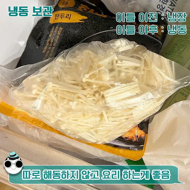 팽이버섯을 다 사용하지 않고 보관할 때 그대로 비닐째 냉장고에 넣어두곤 하는데요. 이렇게 된다면 신선도는 당연히 떨어지게 되니 빠르게 드시는 걸 추천드립니다~