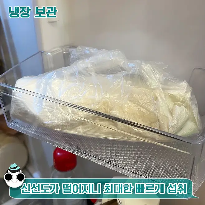 두 번째로 냉장 보관입니다. 냉장 보관할 때도 상온 보관과 똑같이 키친타올에 둘둘 싸서 비닐봉지에 넣어주면 되는데 우리가 여기서 흔히 자주 하는 실수가 있어요.