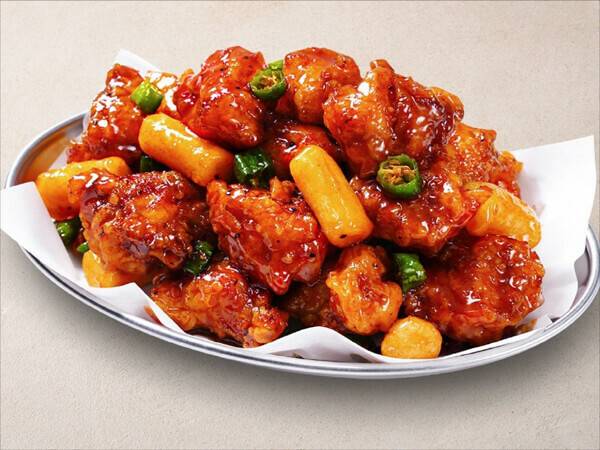 죠스떡볶이, 바르다김선생을 운영하는 외식 프랜차이즈 기업 죠스푸드의 ‘죠스익스프레스’에서는 바삭한 식감으로 무장한 ‘콰삭닭강정’을 만날 수 있다. 바삭하게 튀긴 닭고기와 매콤하면서도 달콤한 특제 양념 소스, 쫄깃한 쌀떡 토핑의 조화가 어우러진 메뉴다. 쌀떡에는 구멍이 뚫려있어 소스가 더욱 잘 배고, 꽈리고추 토핑을 통해 더 깊은 풍미를 느낄 수 있다. 가격은 11,500원이다.