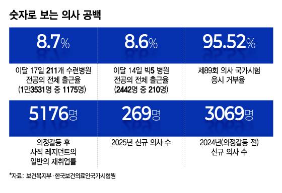 대한의과대학·의학전문대학원 학생협회(의대협)에 따르면 의사 국가시험 응시 예정자 중 95.52%가 의사 국가시험을 거부하면서 제89회 의사 국시 최종 합격자는 지난해의 8%인 269명에 그쳤다. 그마저도 합격자의 19.3%(52명)은 외국 의대 출신으로, 예년 수준(1%가량)의 19배에 달했다. 휴학 의대생 대다수는 올해도 돌아오지 않을 태세여서 의사면허를 새롭게 취득하는 신규 의사는 내년에도 바닥을 칠 전망이다.