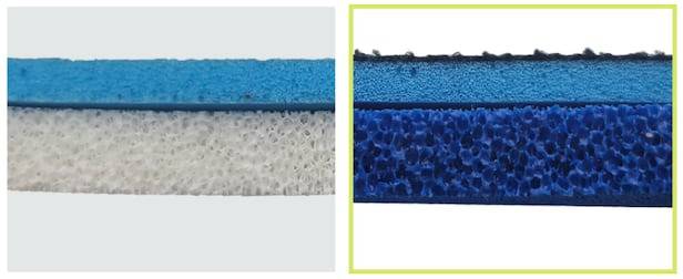 기존 물컹슈즈의 인솔 소재였던 흰색 실리콘 오픈셀은 경도계로 측정했을 때 경도가 4도였는데요. 물컹슈즈 2.0은 천연 고경도 발포 실리콘을 썼습니다. 경도가 24도로 오리지널의 6배에 이릅니다.