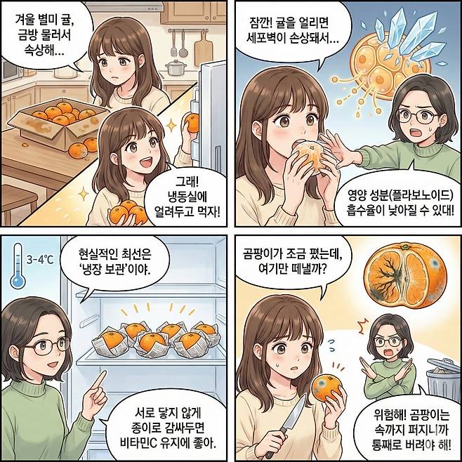 귤을 오래 두다 보면, 껍질에 곰팡이가 생기는 경우가 있다. 이때 눈에 보이는 곰팡이만 제거한 뒤 나머지를 그대로 먹는 일이 종종 있지만, 이는 위험할 수 있다. 곰팡이는 겉에서 끝나는 것이 아니라 귤 속까지 퍼질 수 있으며, 특히 수분이 많고 과육이 부드러운 귤은 곰팡이균이 내부로 쉽게 침투할 수 있는 구조다.