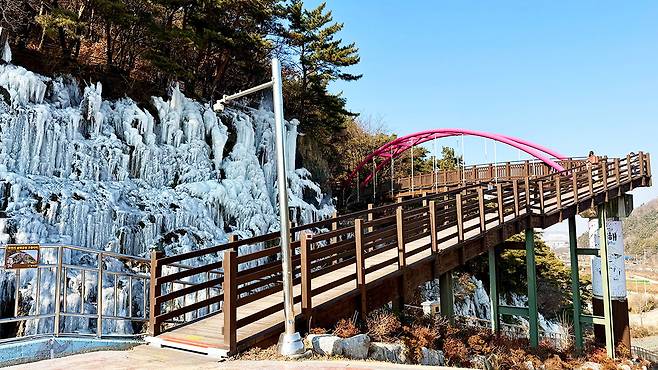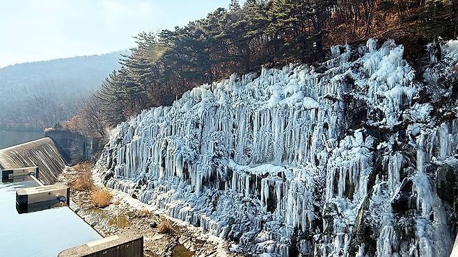 겨울에만 볼 수 있는 특별한 풍경, 바로 10m 높이의 인공폭포가 얼어붙은 ‘빙벽’입니다.폭포수가 한파에 얼어붙으며 형성되는 하얀 얼음벽은 보는 것만으로도 숨이 멎을 듯한 장관을 이룹니다.