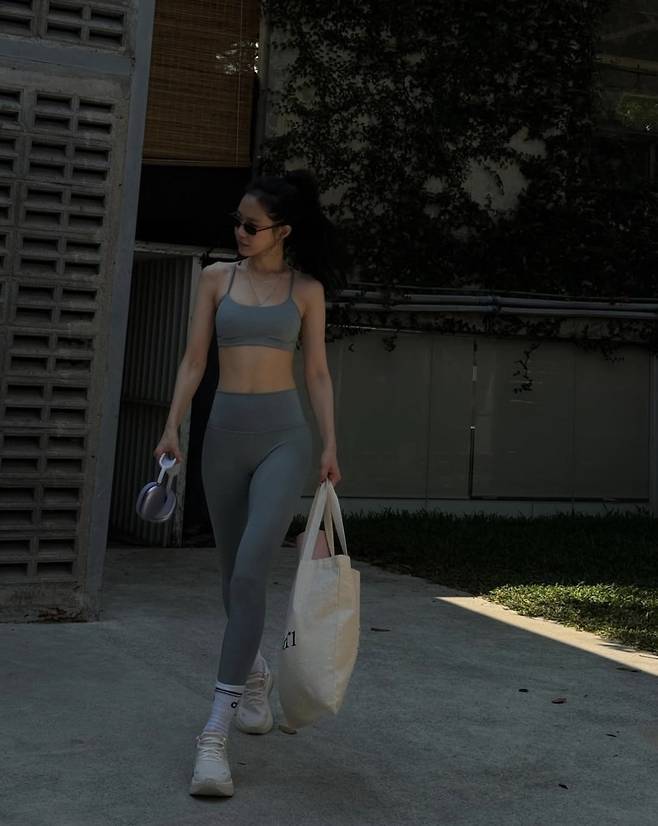회색 계열의 브라톱과 하이웨이스트 레깅스를 매치해 완벽한 보디라인을 강조했으며 여기에 블랙 선글라스를 더해 스포티하면서도 시크한 분위기를 연출했습니다.
