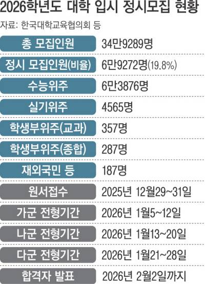 오는 29일부터 3일간 2026학년도 대입 정시모집 원서 접수가 진행된다. 올해 정시모집은 가군(1월5~12일)부터 시작해 다군(1월21~28일)까지 이어진다. 지난 12일 기준 193개 대학의 정시모집 인원은 6만9272명으로, 전체 모집 인원(34만9289명)의 19.8%에 해당한다. 대학들은 전체 모집 인원의 10명 중 2명만 정시에서 선발하는 셈이다. 정시모집 선발 비율은 2024학년도(21.1%)와 2025학년도(20.4%)에 비해 감소했다. 수도권 대학의 정시모집 비율은 34.6%다.
