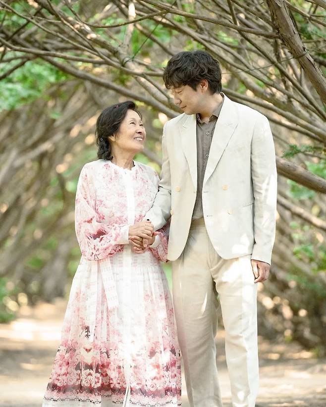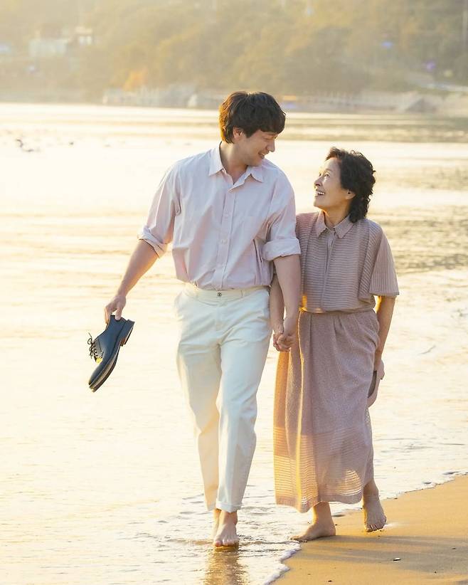 손에 든 블랙 로퍼는 의상 전체의 색감과는 대조를 이루며 세련된 포인트가 되어준다. 또한 함께 등장한 김혜자는 스트라이프 디테일이 들어간 반팔 셔츠와 롱스커트를 매치해 편안하면서도 단정한 인상을 준다. 두 사람 모두 파스텔톤 중심의 컬러 매치로 따뜻하고 조화로운 분위기를 자아낸다.