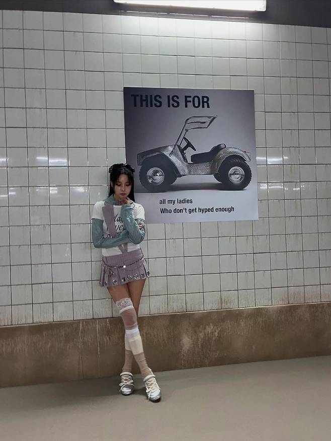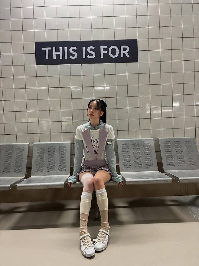낡은 타일 벽에 붙은 "THIS IS FOR" 문구 아래, 트와이스 미나가 덤덤히 앉아있다. 공허한 지하철역의 고요함 속에서 그녀의 스타일은 오히려 강렬한 존재감을 드러낸다. 회색빛 배경과 대비되는 레이어드 룩은 Y2K 특유의 무심한 감성과 자유로운 믹스매치를 상징한다.