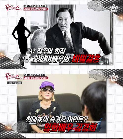 2017년 방송된 종합편성채널 채널A '풍문으로 들었쇼'(이하 '풍문쇼')에서 연예부 기자는 "고 정주영 회장이 무려 38세 연하의 여배우와 비밀 결혼을 했는데, 바로 김경희다"라고 입을 열었습니다.