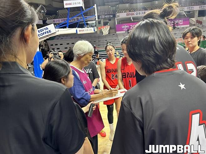 경기가 끝난 후에는 이색적인 장면도 볼 수 있었다. 박신자컵 10주년을 맞아 부산 현장을 방문한 한국 여자농구 전설 박신자 여사가 BNK 선수들을 코트에서 따로 불러 모은 것. 박정은 감독은 물론이고 모두가 그의 이야기를 경청하는 모습이었다.