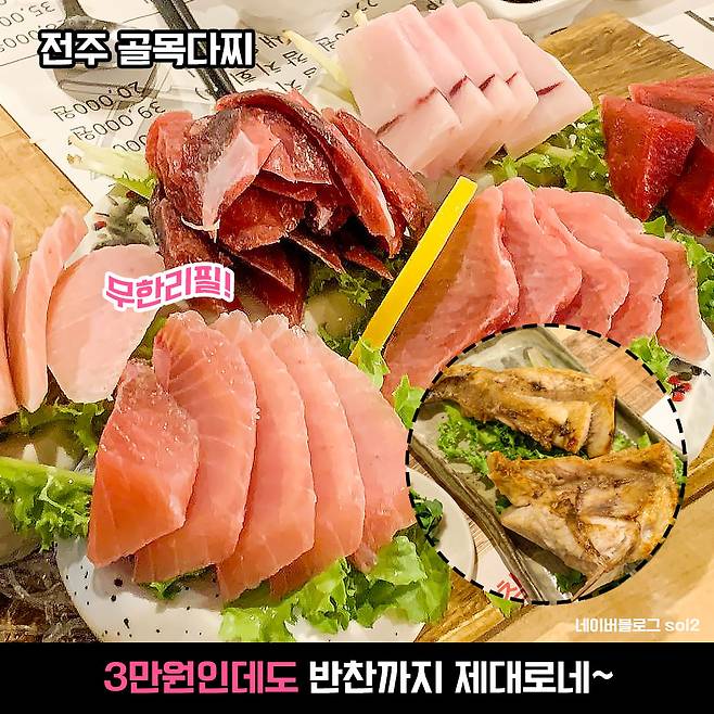 3만원에 참치회를 무한리필로 드실 수 있다면 믿어지십니까아.. 골목 다찌의 모든 참치회 코스는 무한리필이고 우동OR알밥이 포함된 식사까지 제공한다고 해요! 전주에서 이미 가성비 참치집으로 유명한 것은 당연한 듯 ㅎ_ㅎ