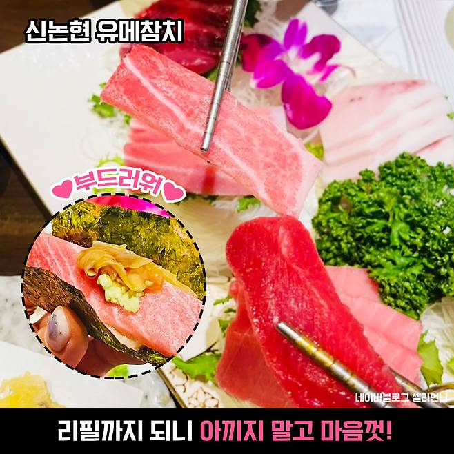 3만원에 무한리필인데도 불구하고 전혀 비린맛 없이 부드러운 참치회를 즐길 수 있다는 점이 가장 매력 포인트! 비록 비싼 참다랑어의 고급 부위는 아니지만 참치는 원래 비싸잖아요~ 이 가격에 신선한 참치를 양껏 먹을 수 있다는 것만으로도 성공!