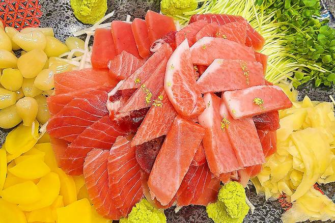 금가루까지 솔솔 뿌린 참치회 등장이요~ 3만원에 무한리필인데도 불구하고 참치 뱃살같은 고급 부위도 함게 들어가 있어요. 게다가 기름기도 적당히 있는게~ 싼 맛에 먹는 참치회같은 느낌 전혀 아님!