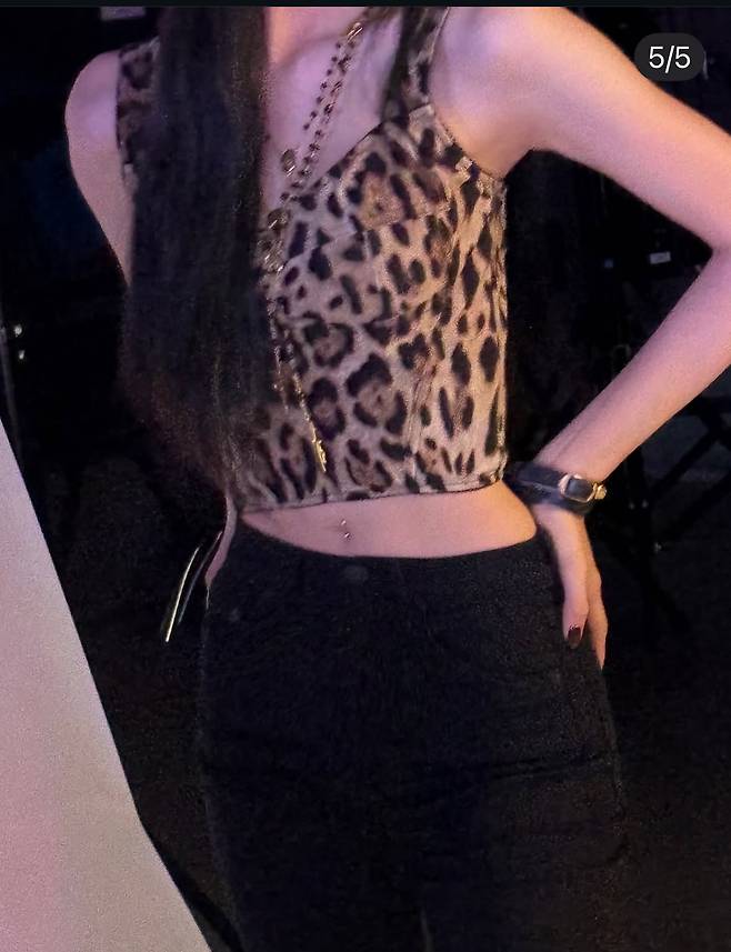 문가영은 이번 레오파드룩에서 돌체앤가바나 뷔스티에 톱과 블랙 팬츠를 매치했습니다.