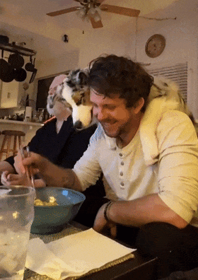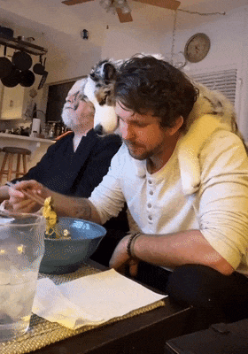 주인이 식사를 하고 있는데 강아지도 먹고 싶어서 주인의 어깨를 올라타 있습니다.