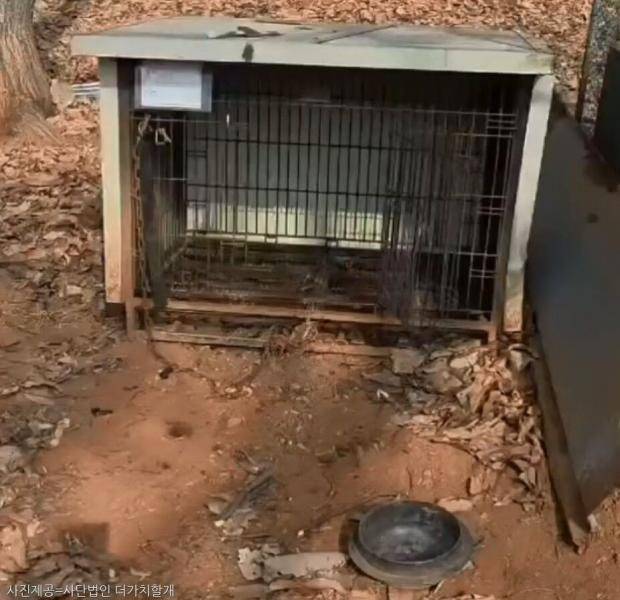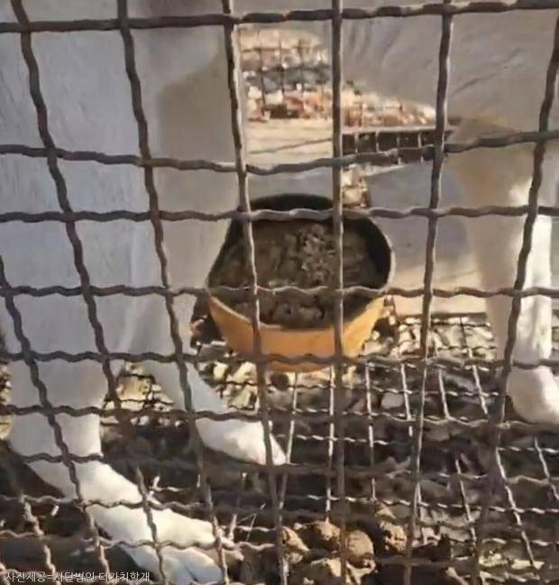 단체에서 제공한 영상 속 개들은 좁은 뜬장 안에 무기력하게 누워있는 모습이다. 먹이는 사료대신 냄비에 음식물쓰레기뿐이었다.