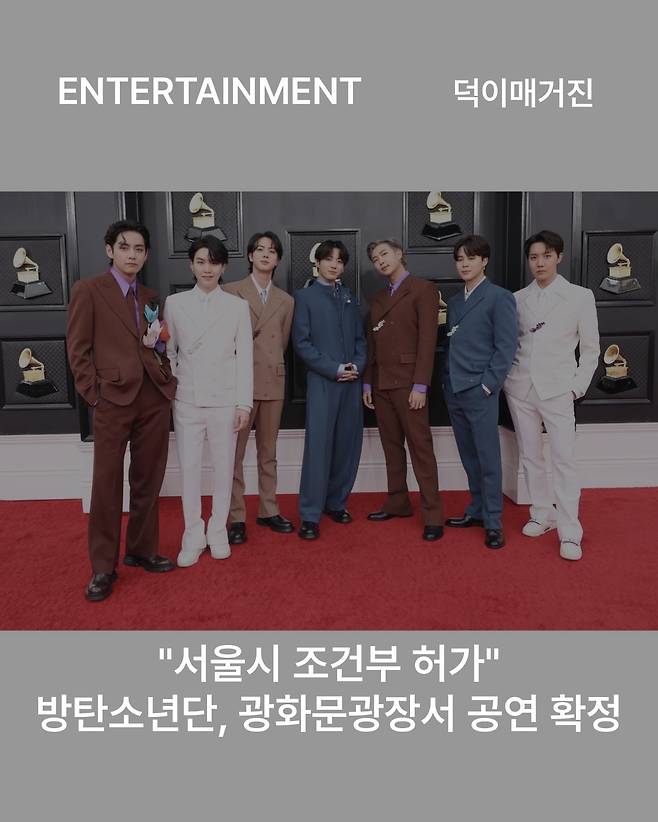 22일 서울시는 광화문광장 자문단회의에서 방탄소년단의 컴백 공연에 대해 조건부 사용 허가를 결정했습니다 앞서 소속사 하이브는 방탄소년단의 컴백을 의미 있게 보여줄 공간으로 광화문광장을 최우선 순위로 꼽은 후 최근 광화문광장을 비롯해 경복궁 및 숭례문 일대 등에 대한 사용 허가를 신청했습니다. 방탄소년단 측은 서울시와 경찰, 국가유산청 등 관계 기관과의 협의를 이어오고 있으며, 국사유산청 측에는 경복궁과 숭례문 일대 등에 대한 장소 사용 및 촬영 허가를 신청했습니다.