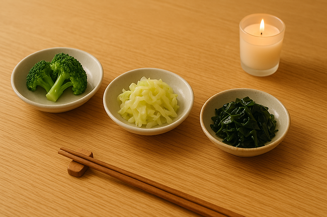 - 브로콜리, 양배추, 상추, 미역, 나물류 등이 이에 해당합니다.