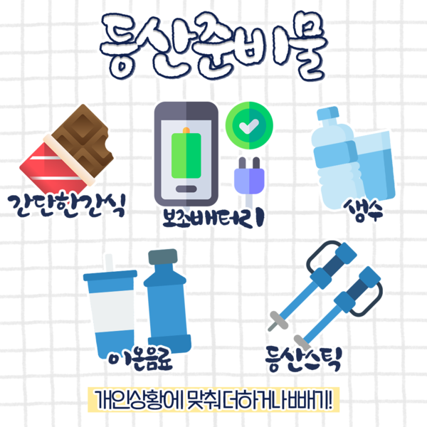 한라산 등반 준비물로는 물, 간식, 보조배터리 보온병, 등산 장비 등이 있으며 개인 상황에 따라 더하거나 빼서 준비하셔야합니다. 특히 성판악 코스에는 매점이 없으므로 필요한 물품을 사전에 챙기셔야 합니다.