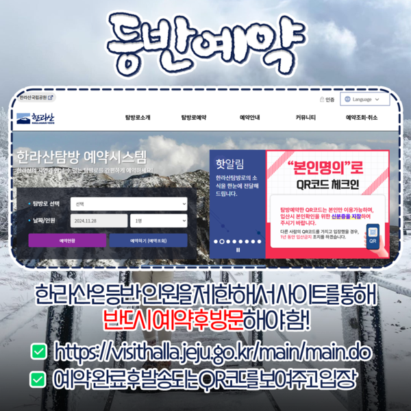 한라산은 등반 인원을 제한으로 방문 전 사전에 공식사이트를 통해 반드시 예약 후 방문하셔야합니다. 한라산 등반 예약은 한라산탐방 예약시스템에서 예약 가능합니다.