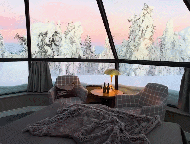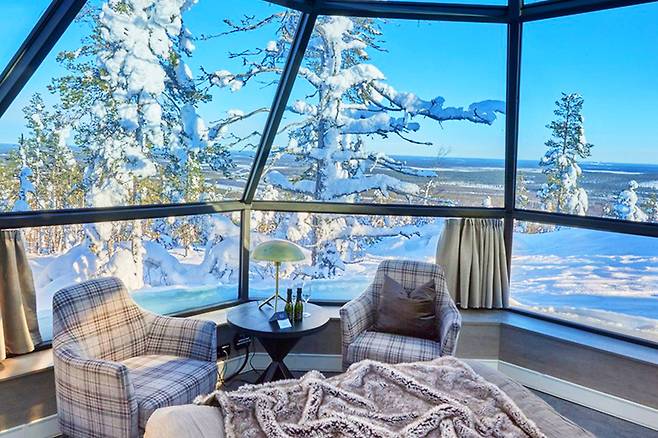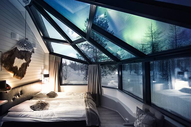 유리로 된 객실: 360도 파노라마로 펼쳐지는 겨울 풍경을 감상할 수 있습니다. 침대에 누워서도 하늘에 펼쳐진 오로라를 볼 수 있어 오로라 관측의 명소로 손꼽힙니다.